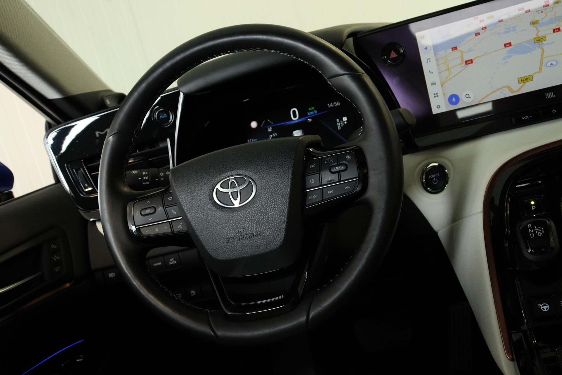 Binnen in de Mirai is het een en al luxe. Het interieur is prachtig afgewerkt met alle oog voor detail. Natuurlijk is deze Mirai voorzien van een 360graden parkeercamera, digitale achteruitkijkspiegel, JBL audio met 14 speakers, het nieuwste 12,3" Toyota navigatie met draadloze Apple Carplay en Android Auto, Adaptieve Cruise Control, Panoramadak, Head Up display van maar liefst 10", Elektrisch bedienbare voorstoelen met geheugen functie voor de bestuurder, stoel verwarming en koeling voor de voorstoelen maar ook op de achterbank heb je verwarming én koeling die je kunt bedienen vanaf de armsteun, waar je ook de radio en de airconditioning mee kan regelen.