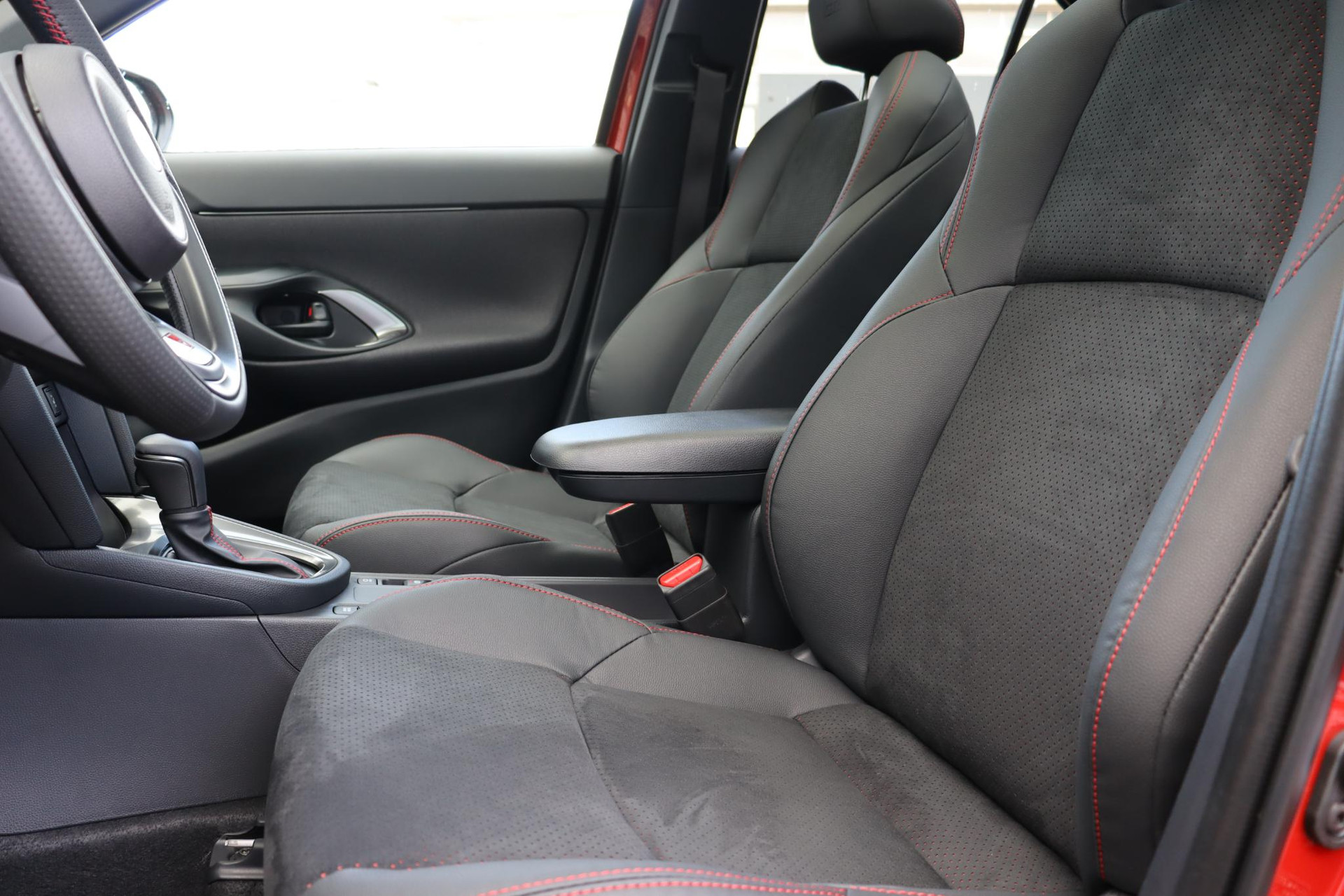 GR Sport is in de kleur Emotional Red premium metallic met zwarte bovenzijde. Deze Yaris Cross GR Sport is Rijk uitgerust met onder andere parkeersensoren voor en achter, 18 inch lichtmetalen velgen, Apple Carplay/Android Auto, Adaptive Cruise Control, draadloos telefoonlader, Keyless Start/Entry, stoelverwarming, Blind Spot Monitor, panorama dak, HUD en natuurlijk de GR Sport Detail op het interieur en exterieur en meer!