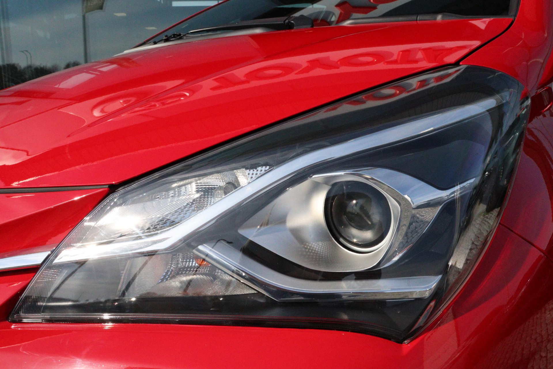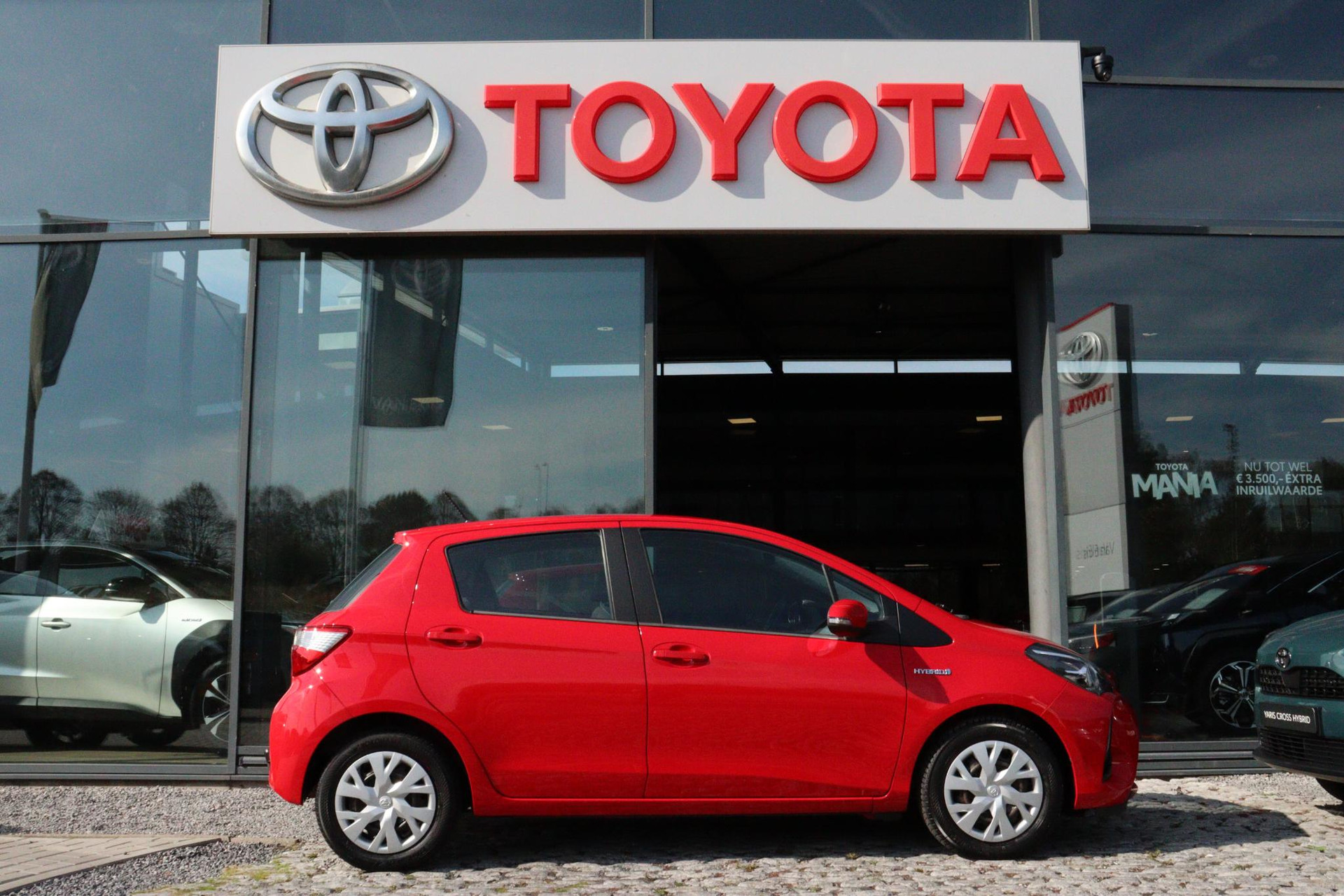 Toyota Yaris 1.5 Hybrid Active In de kleur Fire Red, Is Dealer onderhouden en is voorzien van, Trekhaak, Climate Control, Cruise Controle, Bluetooth, Parkeercamera en nog veel meer!